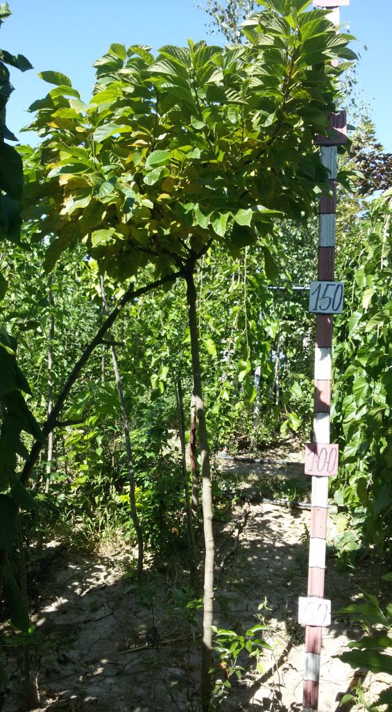 Шовковиця куляста – дуже гарне прищеплене на штамбі декоративне дерево. Листя велике, форма крони куляста, плоди середніх розмірів, чорного забарвлення, дуже смачні, ранні, з розтягнутим періодом дозрівання. Улюблене штамбове дерево ландшафтних дизайнерів. Дуже гарна в одиничних і групових алейних посадках. Морозостійкість вище середнього. Висота дорослого дерева 3-4 м в залежності від висоти штамбу.
